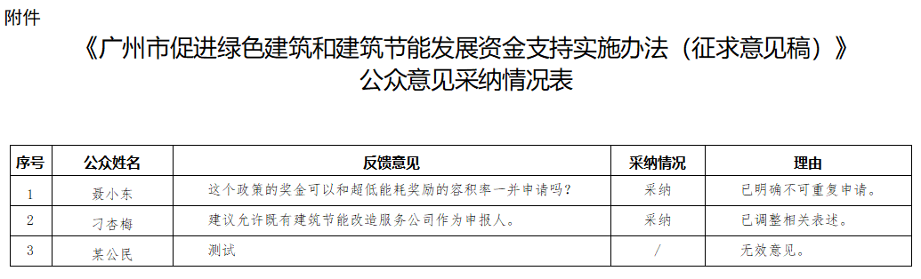 为确保《广州市绿色建筑和建筑节能管理规定》顺利实施,结合广州市绿色建筑和建筑节能管理工作实际,我局草拟了《广州市促进绿色建筑和建筑节能发展资金支持实施办法(征求意见稿)》。我局依据《广州市规章制定公众参与办法》,于2024年6月7日至7月10日,通过局网站向公众公开征求对于《广州市促进绿色建筑和建筑节能发展资金支持实施办法(征求意见稿)》的意见,共收到意见和建议3条,有效2条,采纳2条,部分采纳0条,解释说明0条,未采纳0条,详见征求公众意见采纳情况表(附件)。