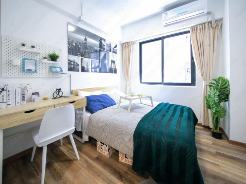 房源描述 : •房间配置:床架、床垫、书桌、书椅、沙发、茶几、床头柜、大容量衣柜、鞋柜、冷暖空调、全自动烘干洗衣一体机、冰箱、新风系统、独立卫生间 •其他配置:公共厨房、公共餐厅、健身房、休闲区、阅读区、投影室、桌球室、安全指纹门禁、公共电梯、公寓超市、公寓宽带、智能门锁、安全监控、快递代收、空中花园 周边配套:公寓200米内有商业街、美食街、菜市场、水果城等,生活、休闲娱乐一体化,属该区域最繁华地带,且消费超级亲民,是全广州消费较低地段! •公共服务设施费:170元/月