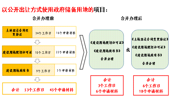 使用公开出让用地的,改革前建设单位通过招拍挂拿地后,需依次办理《建设用地规划许可证》、《建设用地批准书》,共需19个工作日、29项申请材料;合并办理后,整体所需时间仅为3个工作日、时间大幅压缩了84%,申请材料则减为6份、精简了79%。此外,成立项目公司的,土地出让合同变更协议、建设用地规划许可证和建设用地批准书三项开展合并办理,整体时限从原来的53个工作日压缩为6个工作日申请材料则由45份减至10份。