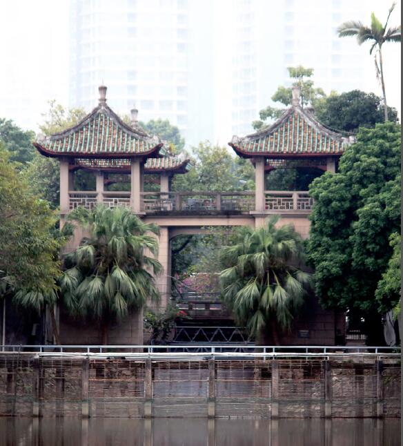 东湖公园船闸是广州市区内少数现存完整的排洪船闸,与东山湖公园同期建成,是1950 年代城市防洪和园林建设相结合的典范,现仍正常使用。