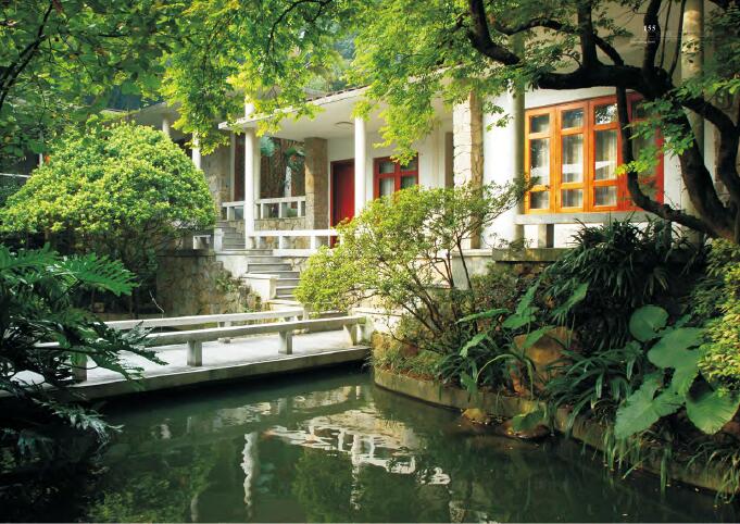山庄旅舍细节设计尤其精致,柱径只有20cm,通过设置反梁减薄建筑出檐的厚度,使其非常飘逸,镂空花架、冰裂纹砌石与白色粉墙的配合,结合传统的套色玻璃窗,体现出建筑师对材料的优秀解读与运用。山庄旅舍深具中国传统园林的风韵。1993年获中国建筑学会优秀建筑创作奖。