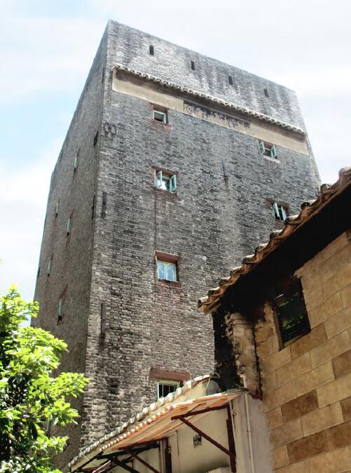 光复中路当楼旧址位于光复中路233后右侧。建于民国时期,高5层,宽9米,深约11米,占地面积约100平方米。建筑为砖混结构,青砖砌筑,外墙小窗保持完好。首层高4.6米,其余层高3米多,总高度约17米。建筑左侧墙开有9个当铺特有的宽40厘米、高80厘米的小窗,窗上有铁枝。后墙上开有8 个小窗,五楼四面均有4个射击孔。楼房内部还保留木楼梯。楼房外观基本保存,内部间隔部分改变,每层均被间隔成多个大小不一的房间。现暂作治安队的宿舍使用。