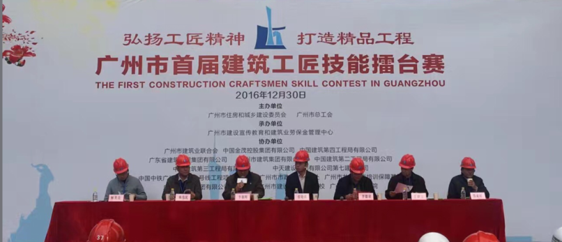 2016年12月30日上午,由市住房城乡建设委和市总工会联合主办、市建设宣教劳保中心具体承办的广州市首届建筑工匠技能擂台赛(以下简称:擂台赛)在广州市荔湾区鹤洞路157号中国建筑第四工程局“珠江金茂府工程项目部”顺利开幕。市住房城乡建设委副主任李朝晖代表擂台赛组委会简要介绍了本次比赛的筹备情况,市总工会副主席李德球宣读了市人大常委会副主任、市总工会主席、省总工会副主席赵小穗的贺信,市政府副秘书长张晓波出席了开幕式并讲话。来自各区建设局以及中建四局、省建工集团、市建筑集团、金茂控股集团、市建筑业联合会等单位的120余名嘉宾受邀参加了擂台赛开幕式。