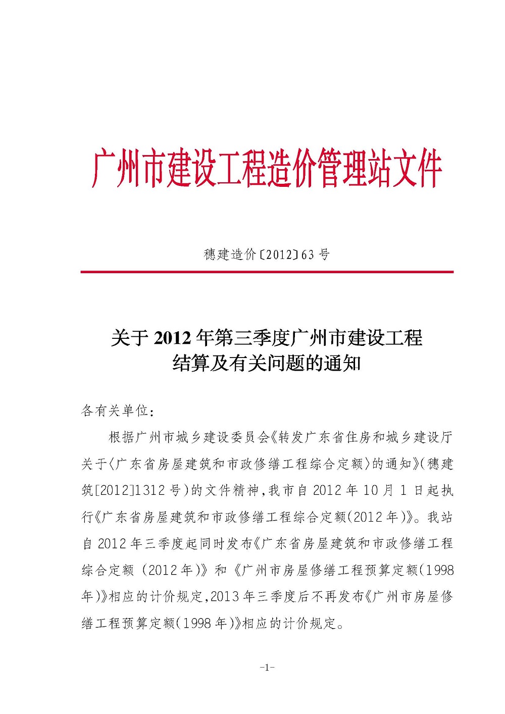 【结算文】关于2012年第三季度广州市建设工程结算及有关问题的通知