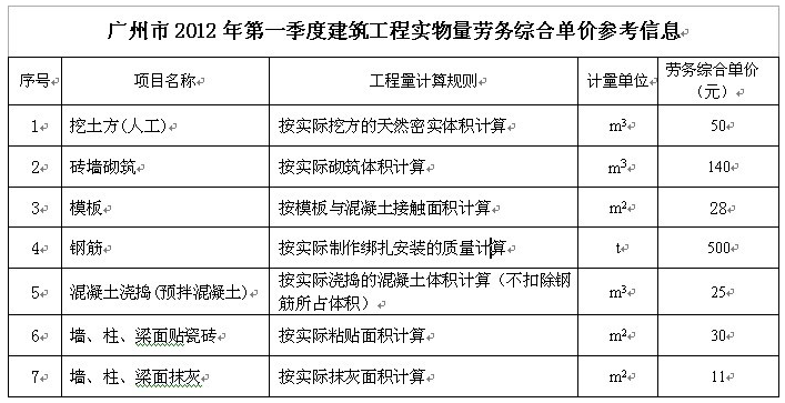 我站从2012年第一季度开始发布建筑工程部分实物量劳务综合单价参考信息,旨在反映建筑工程劳务市场价格行情,为相关单位测算工程成本,签订劳务合同提供参考。该价格信息是经过收集广州地区劳务价格市场情况,整理汇总而成。实物量劳务综合单价包含了基本工资、工资性补贴、生产工人辅助工资、职工福利费、生产工人劳动保护费,以及按规定应缴纳的住房公积金与社会保险费,其各工种工作内容已包括主要施工工艺作业和辅助作业。本综合单价测算方法与我站每季度结算文件发布的人工日工资价格有所区别,不作为工程预结算、最高限价、司法鉴定、处理工程造价争议及其它纠纷的依据。