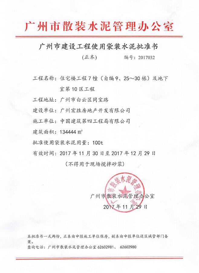 广州市建设工程使用袋装水泥批准书(住宅楼工程7幢(自编9、25~30栋)及地下室第10区工程)