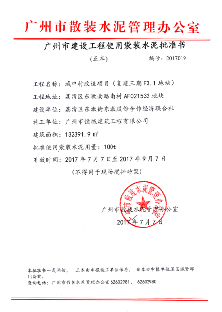 广州市建设工程使用袋装水泥批准书(荔湾区东漖南路城中村改造项目)