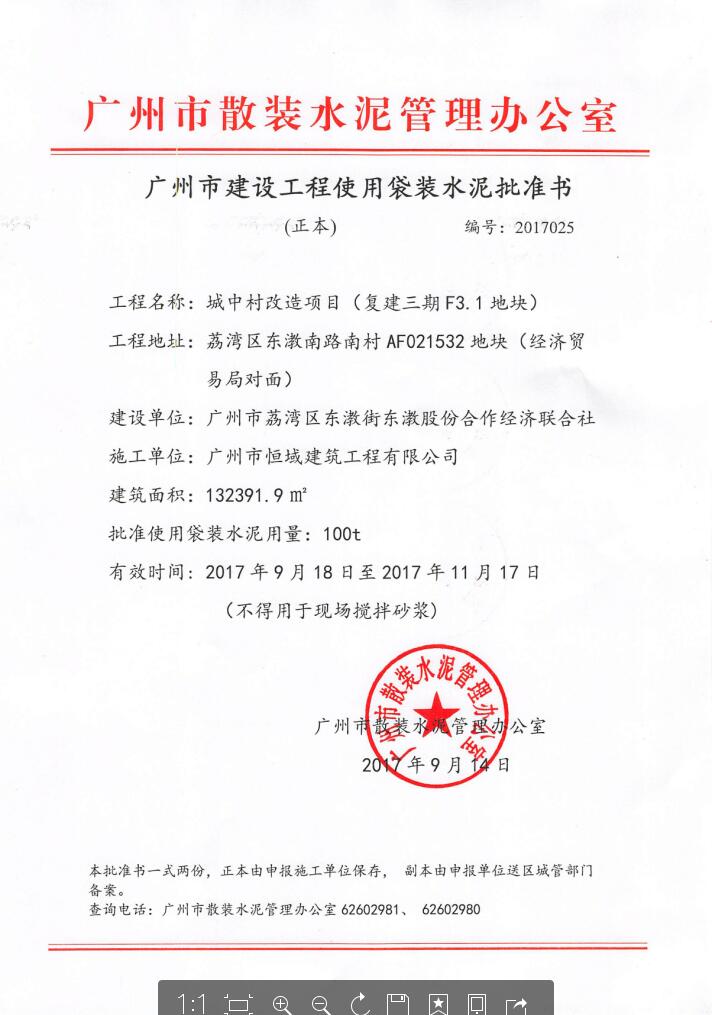 广州市建设工程使用袋装水泥批准书(城中村改造项目复建三期F3.1地块)