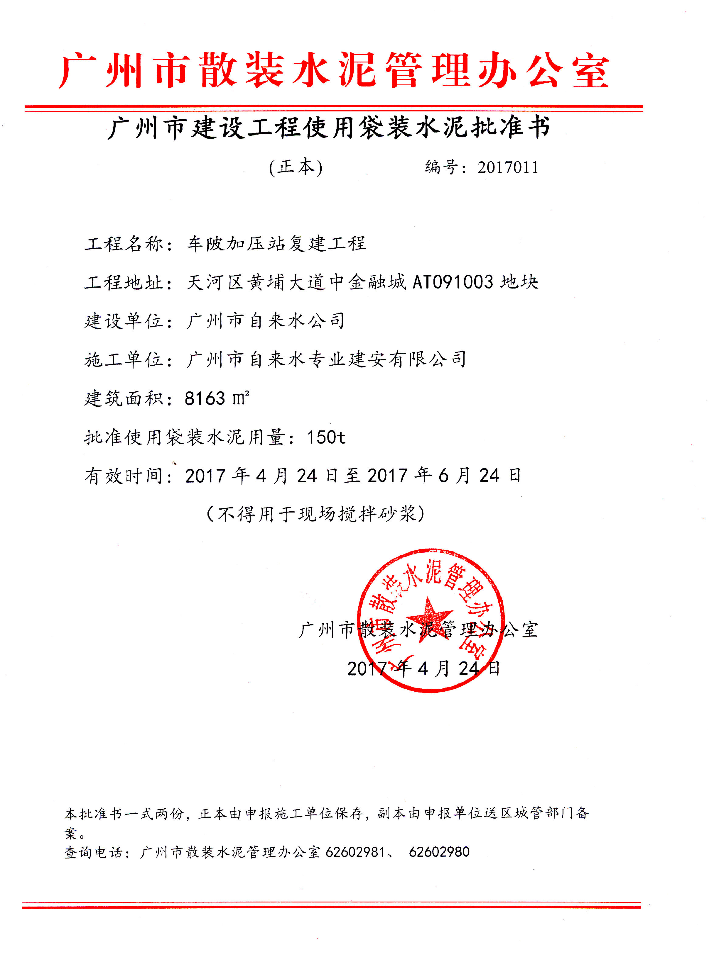 广州市建设工程使用袋装水泥批准书(车陂加压站复建工程)