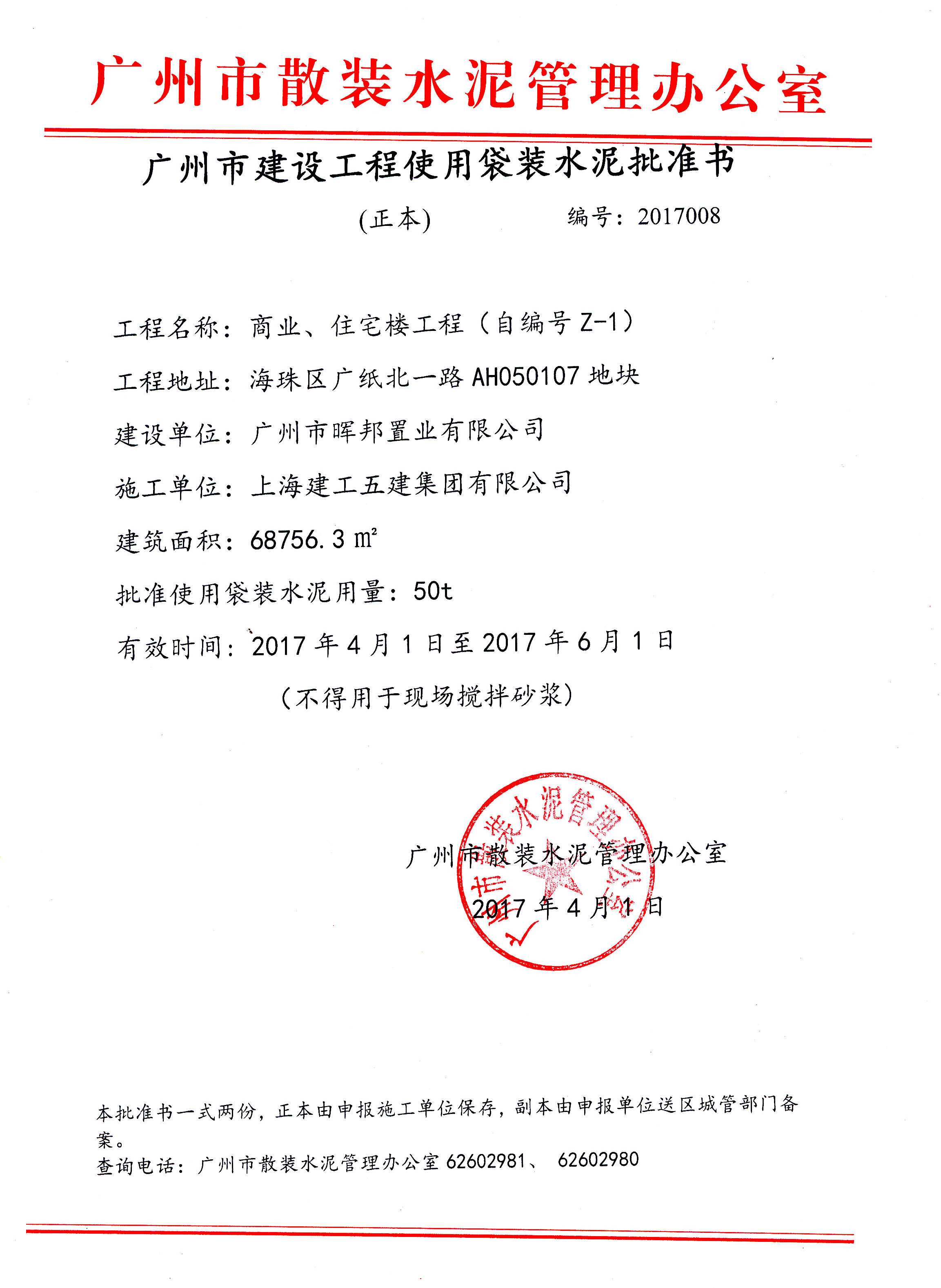 广州市建设工程使用袋装水泥批准书(海珠区商业住宅楼工程(自编号Z-1))