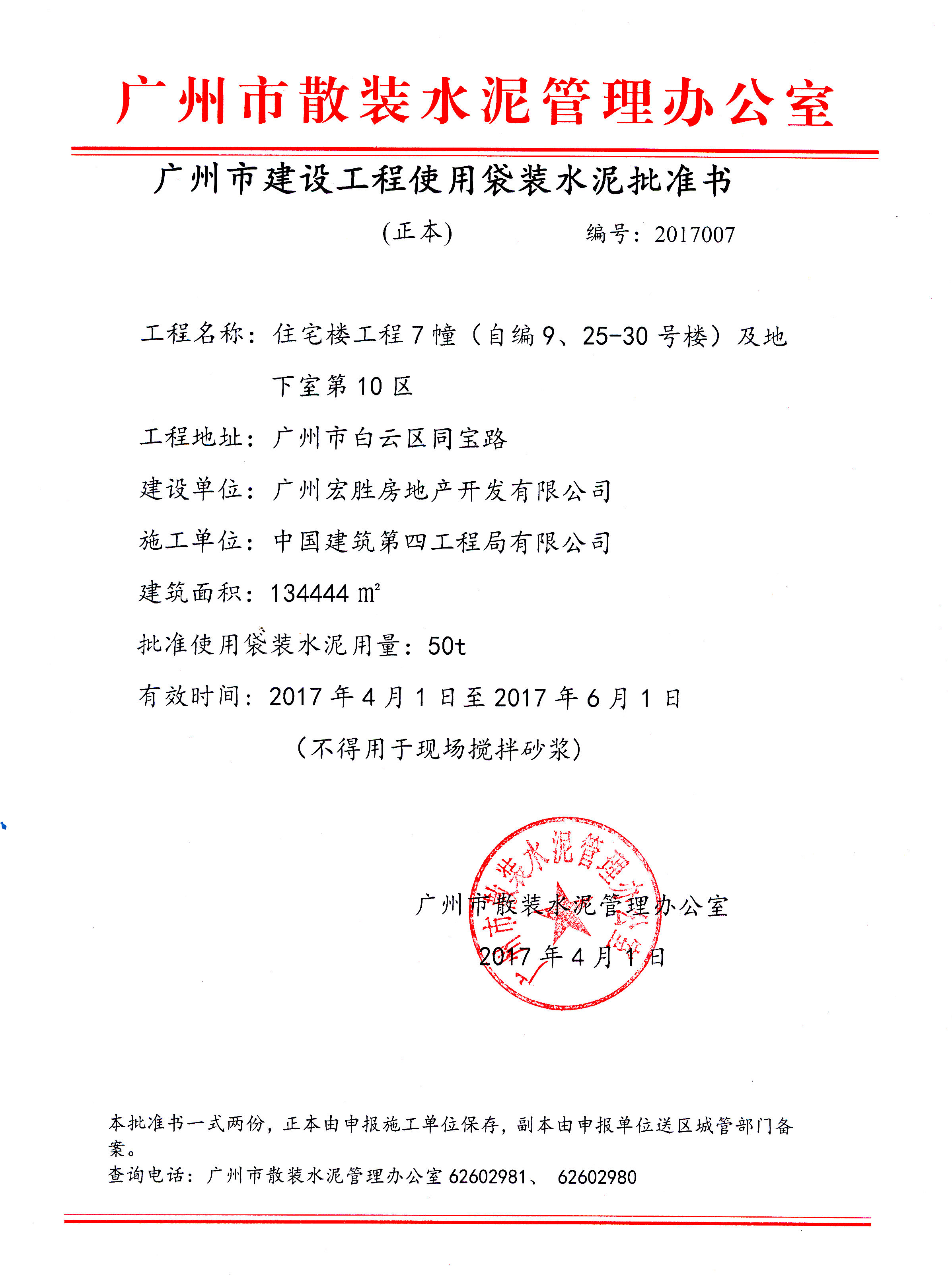 广州市建设工程使用袋装水泥批准书(同宝路住宅楼工程7幢及地下室第10区)